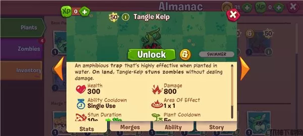 “来吧僵尸们——水很赞呢!”他们是这么想的……缠绕海草正潜伏着,随时准备抓住敌人,将其拖入幽暗的深海,使其再也不见天日。在陆地上,她就没那么致命了(她对自己的气囊有点敏感)。