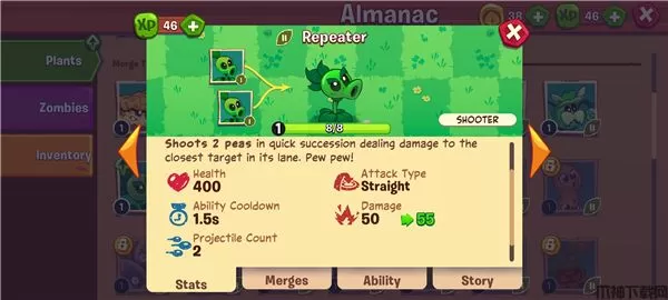 双发射手发射的豌豆数量是普通豌豆射手的两倍,而且从不放过任何炫耀的机会。它们还爱重复自己的话——比如,你知道双发射手发射的豌豆数量是普通豌豆射手的两倍吗?诶你知道?只是确认一下。双发射手很少被邀请去长途驾车旅行。