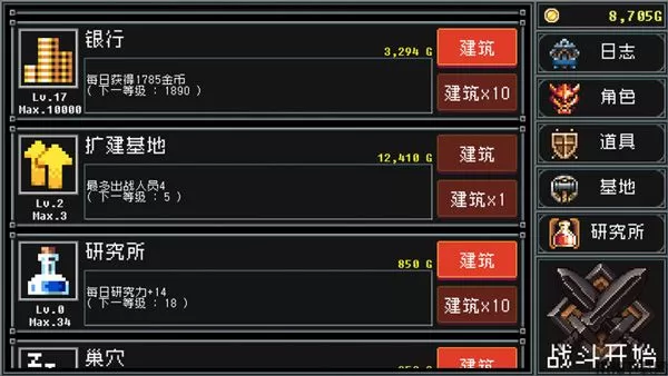 游戏中还有一个研究所,研究所里是研究各种各样的东西,可以让建筑更快更省钱的升级,也可以装备更高更猛的强化,当然,研究所的东西是免费研究的,不过研究起来需要很多天,也就是点击研究后需要去打副本,使研究所的研究项目更快完成。