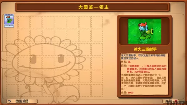 特点:进行远程攻击时,连续发射两颗寒冰豌豆(每颗造成25点伤害);进行近战攻击时,释放冰龙吐息(造成60点伤害并附加冰冻减速效果)。