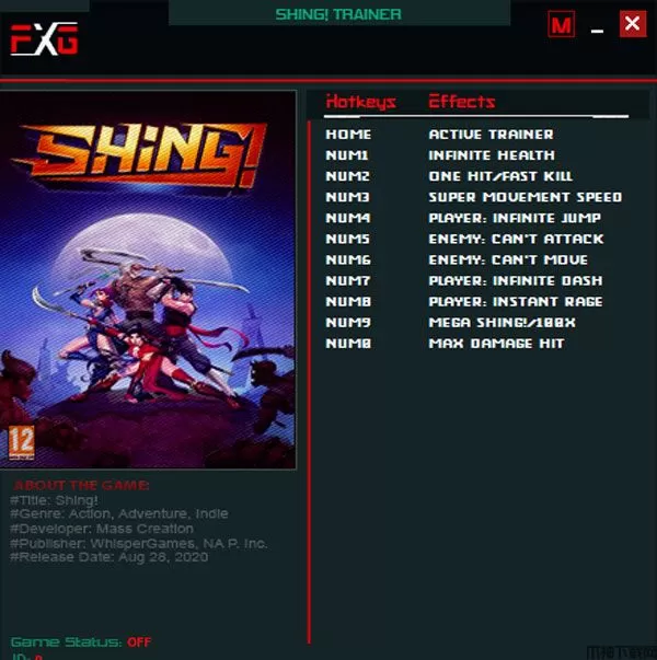 Shing十项修改器是由大神FutureX所针对游戏《Shing!》制作的一款多功能游戏辅助修改器,shing!是一款卡通风格的横版动作游戏,游戏稍微的有一些难度,所有玩家在游戏中是需要时间的沉淀来磨炼才能对这款游戏上手,游戏小编推荐的这款修改器你就能够在游戏中尽情连招,无双敌人,这款修改器能够帮助您修改游戏中包含生命,速度,伤害等十项数值数据,让你轻松过关,欢迎有需要的朋友下载使用!