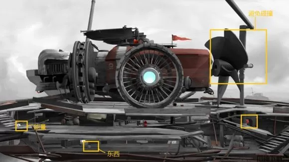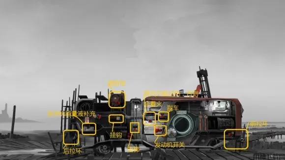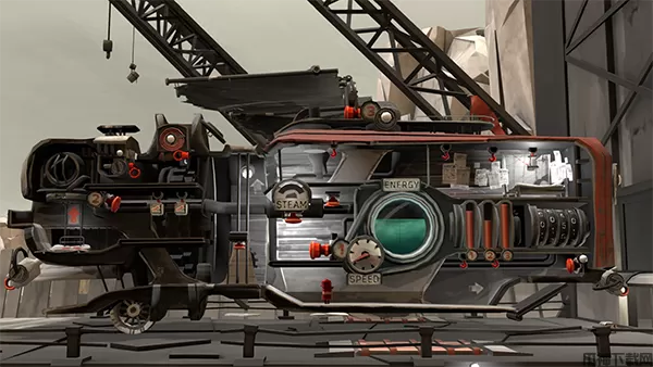 3、 一直前行就到了帆车的地方,车里有许多挂钩很好用,用法:v拿住物品,跳起按v就能挂到挂钩上了,能量液补充:把能量液放到托盘上,按旁边按钮就可以了。关于能量液:能量液根据体积判断分:大,中,小。大的一发就满了,中的要2发 ,小的只有四分之一, 消防栓的话用的是能量液。切记,所以前期避免碰撞,坏了要扑火而且没装备修补很尴尬,后期有装备的话可以随意。至于开车,一般老司机都会,很简单。无非油门和刹车。注意steam蒸汽的地方不要过热就好,热了就顶一下释放热量的同时还可以“氮气加速”(这招最后面很关键)。