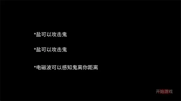 1、游戏开始,需要注意的是,道具盐是可以驱逐女鬼的,电磁波可以探查女鬼离玩家的距离,方便逃跑和躲藏。