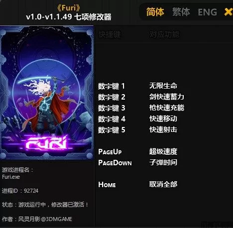 Furi修改器是同名游戏《Furi》的一个非常实用的修改器,这个修改器的功能强大,有着非常不错的可玩性,修改器的功能非常多,能够快速的将游戏内的数值进行修改,比如无限生命,无限速度等等,能够让你游戏变得更加轻松,还有着快速射击的功能,能够帮你在游戏所向披靡,如果喜欢可以下载。