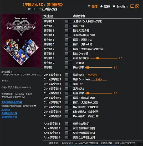 王国之心3D梦中陨落修改器,该修改器集合了二十五项必备功能,包括无敌、锁血、无限物品、无CD等所有功能,可提供无限金钱,自定义伤害倍率功能,操作简单,亲测有效,同时,王国之心3D梦中陨落全能修改器还支持简体、繁体、英文三种语种,后文附有详细的图文教程,有兴趣的朋友不妨下载体验。