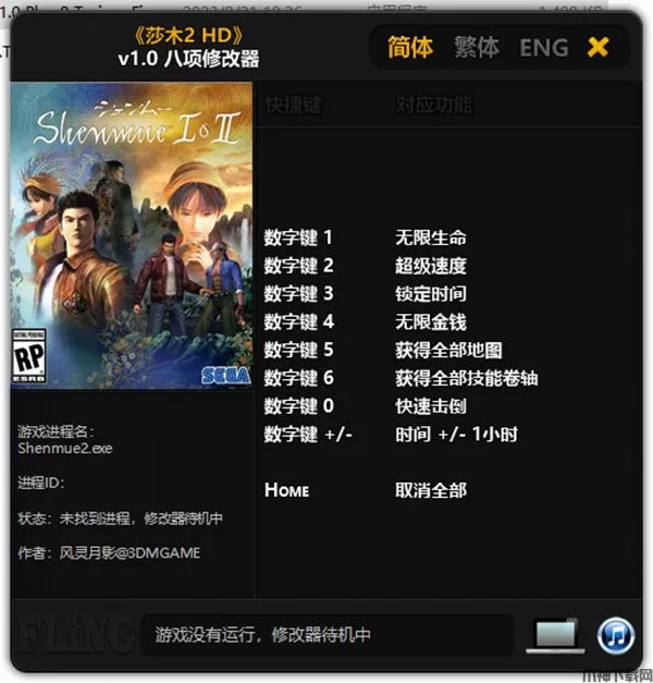 莎木2八项修改器风灵月影版是一款专门针对游戏莎木2制作的游戏修改辅助工具,通过这款修改工具可以减轻玩家的游戏负担、轻松通关游戏,这款修改器拥有无限生命、超级速度、锁定时间、无限金钱、获得全部地图、快速击倒等多项辅助功能,可以给玩家提供更好的游戏体验,小编建议修改器适当使用,使用过度将影响游戏的乐趣,需要的朋友赶快在本站下载吧。