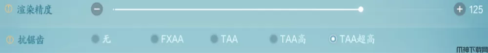 2、对于享受细腻画质,讨厌锯齿感的仙友:可以提高渲染精度,打开抗锯齿TAA来提升画面细节