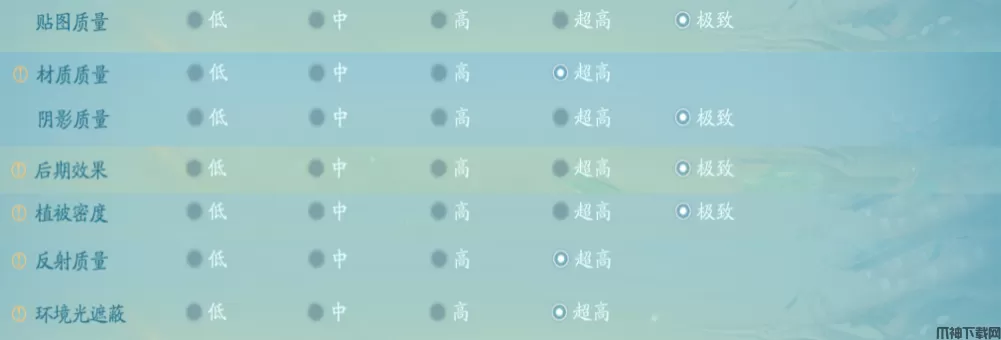 9、材质质量:表现用于物体对光的体现,包括高光、纹理细节、光照算法,金属质感等,材质质量越高,物体表现越真实,同时也会加大设备消耗,建议根据个人设备的卡顿情况适当调节