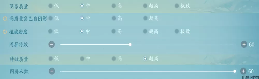 4、对于喜欢流畅战斗、想在副本或仙社战中尽情体验的仙友:可以尽量降低阴影质量、高质量角色自阴影、植被密度,并且在设备允许的情况下适当提高同屏特效数量,特效质量、同屏人数