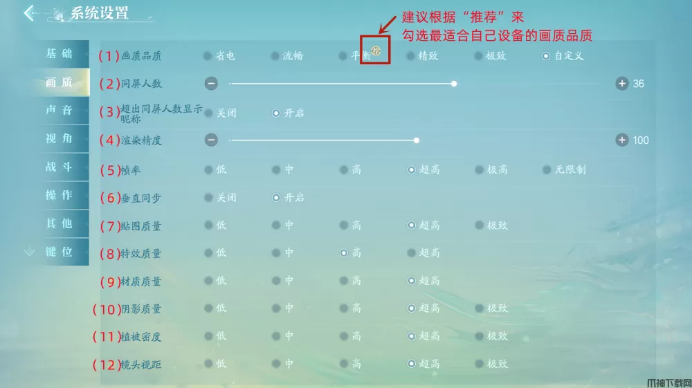 1、画质品质:游戏根据玩家设备的CPU、显卡、内存等数据为玩家推荐的标准配置,如果不太想调节细节的玩家可以直接选择有(荐 )字印章的选项