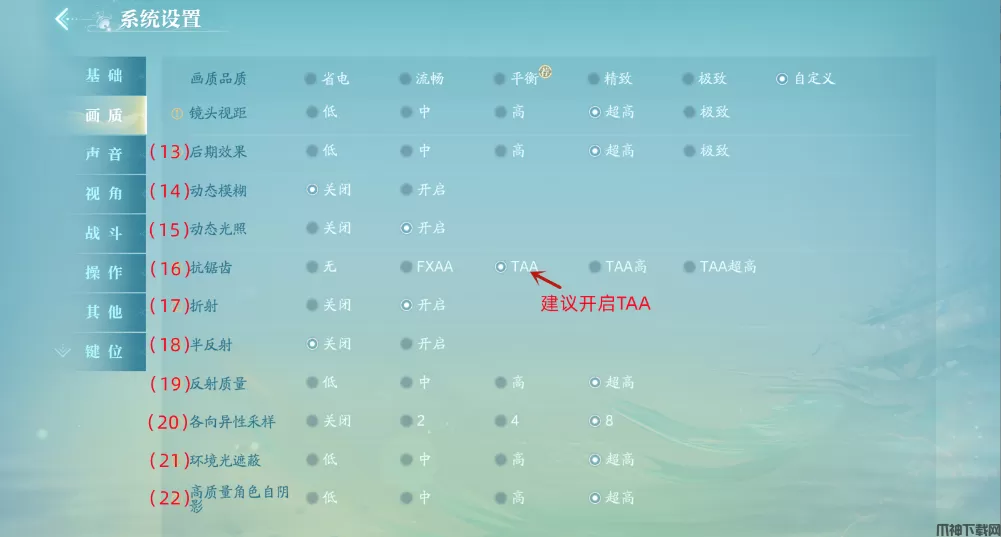 16、抗锯齿:缓解降低由于画面分辨率造成的模型边缘锯齿感的效果,开启后画面会变得更精致,但是会大幅度增加设备功耗,PC端建议开启TAA