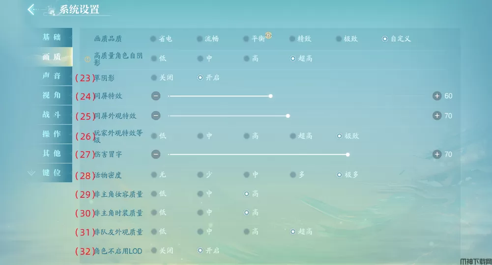 30、非主角时装质量:除了玩家自身外其他玩家和NPC的时装质量,越高表现越细致,根据个人设备的卡顿情况适当调节