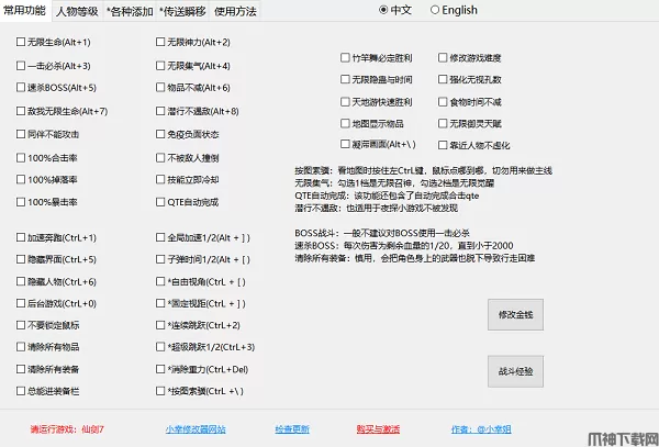 仙剑奇侠传7多功能修改器小幸版,这是由小幸大神专为此游戏制作的一款游戏辅助工具。该修改器版本为绿色版本,使用起来极为的便捷,玩家只需要在本站下载安装,然后打开游戏再开修改器即可使用,并且它还能够为玩家们提供许多修改功能,支持常用功能、人物等级、各种添加、等多种多样的修改功能,全方位满足玩家的游戏需求,大幅度减小游戏的难度。同时仙剑奇侠传7多功能修改器还支持中文、英文两种语言,安全无毒无广告,但为了避免丧失游戏的体验性,小编还是建议大家适当的进行修改,还在等什么,有需要的玩家快来下载使用吧!