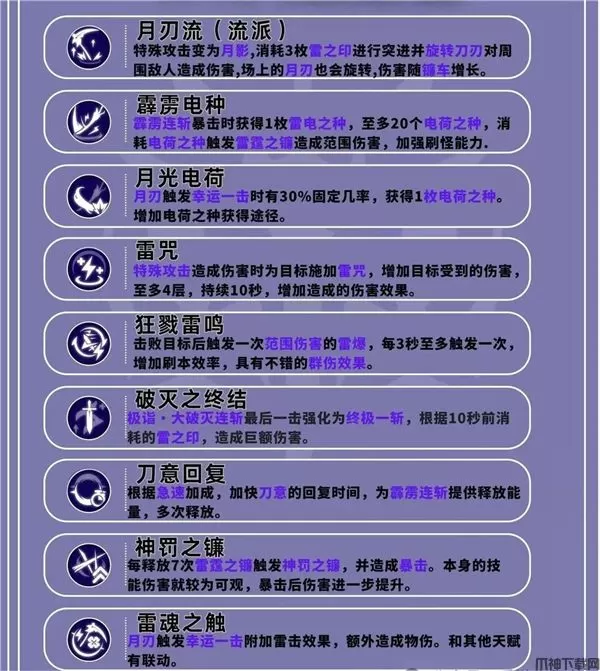 月刃流整体天赋可以从霹雳连斩进行强化,加快刀意的回复,最后通过多次打出雷霆之镰从而打出高伤害。