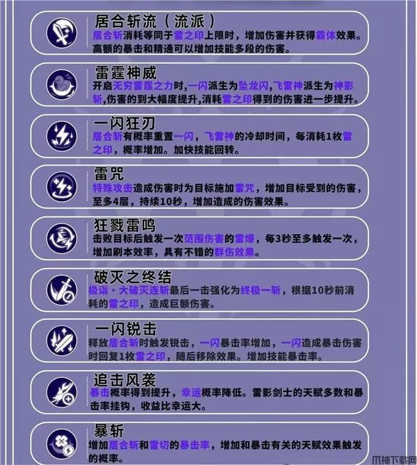 一闪和飞雷神通过派生强化后的技能伤害也较为可观,也可作为主要输出技能。居合流更适合单体例如BOSS类短时间内打出单体高爆发。