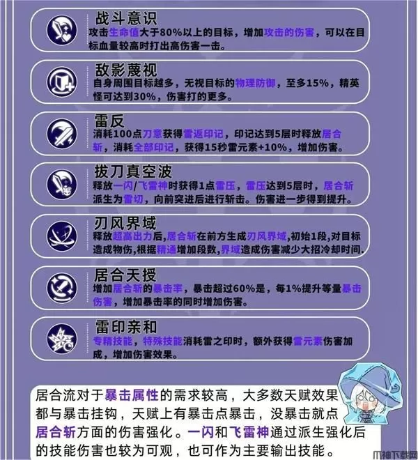 居合流对于暴击属性的需求较高,大多数天赋效果都与暴击挂钩,天赋上有暴击点暴击,没暴击就点居合斩方面的伤害强化。