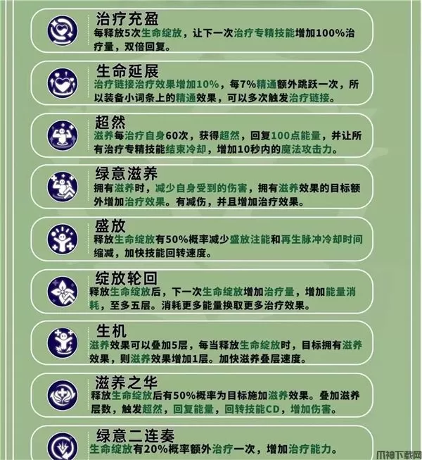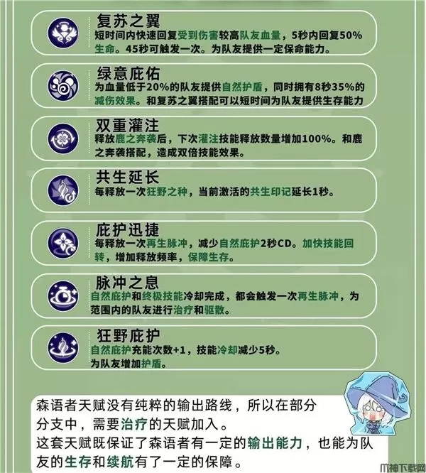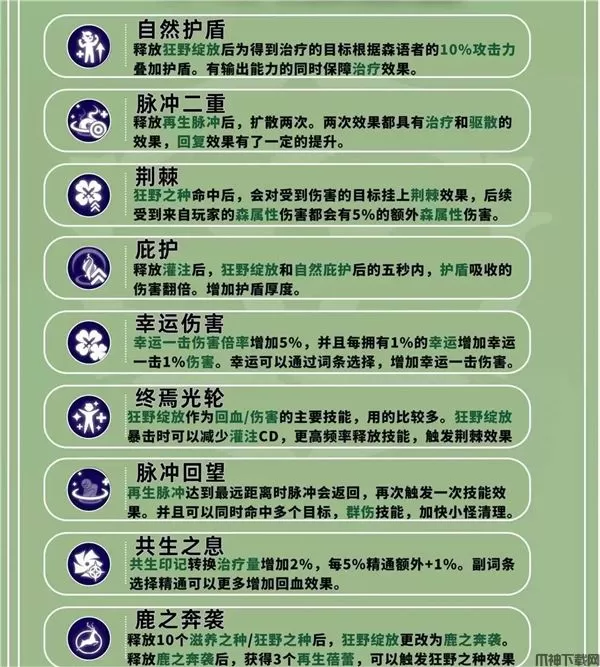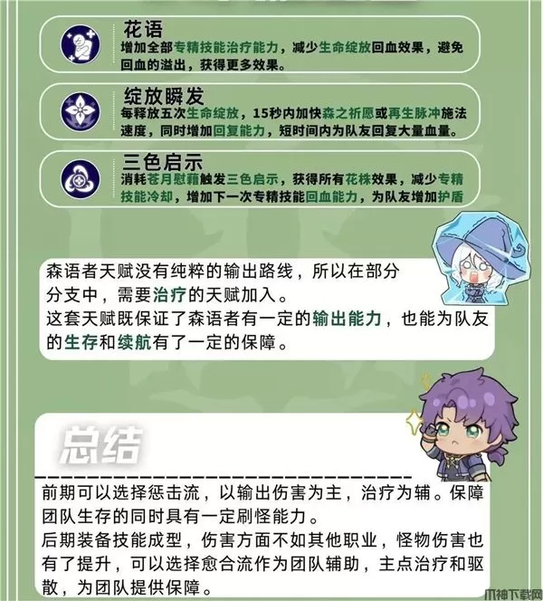 愈合流森语者作为团队中的辅助主要以治疗和驱散效果为主,保障队友生存。没有输出能力,所以多数情况下推荐组队刷图时选择愈合流,单人过剧情刷副本还是推荐惩击流。