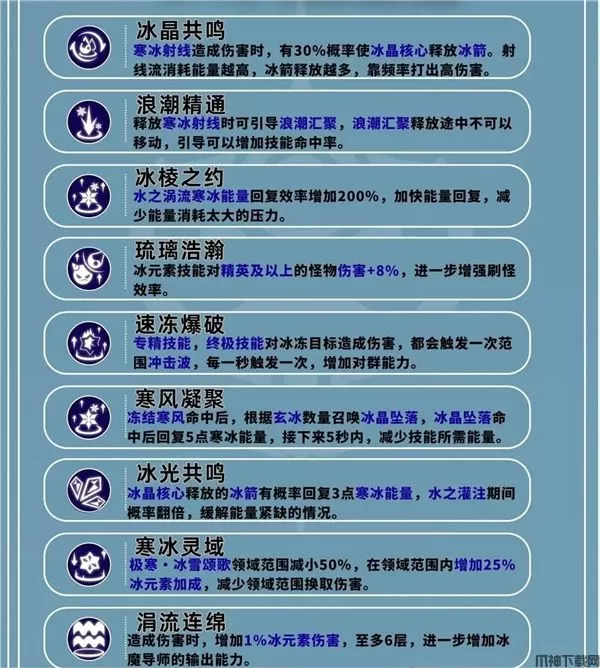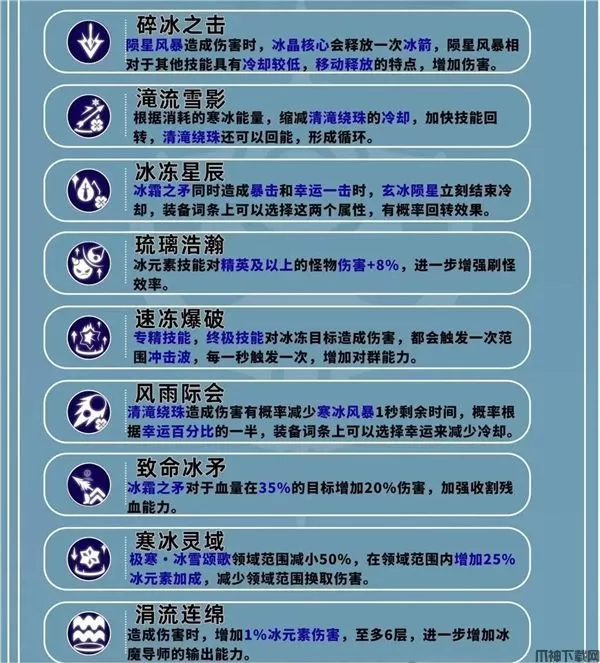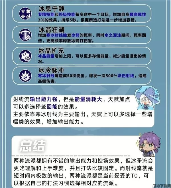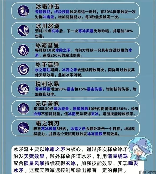 冰矛流拥有稳定的的持续输出能力,以冰霜之矛为主要的核心,通过移动释放不断的消耗敌人血量。天赋中也有一定的回复寒冰能量和技能冷却效果,可以很好的循环。