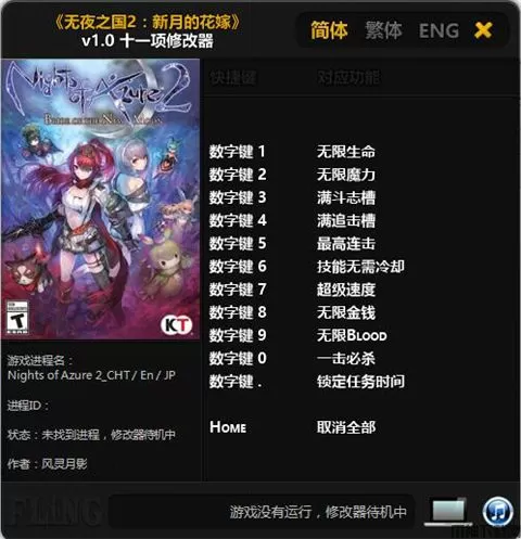 无夜之国2新月的花嫁修改器是专为大型主机pc游戏《无夜之国2新月的花嫁(Nights of Azure 2: Bride of the New Moon)》由风灵月影量身定制的一款绿色免费的游戏辅助修改工具软件。使用这款修改器不但能够为你带来无限生命、无限魔力、满斗志槽、超级速度、无限金钱和一击必杀等以下十一项功能,进入游戏后通过指定热键即可快速开启,简单快捷高效,降低游戏难度,帮助玩家轻松解决战斗,从而让你获得更佳的用户体验。但为避免游戏乐趣的遗失,请大家适度进行修改!