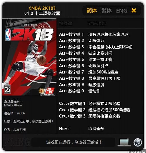 nba2k18修改器是针对于超人气篮球模拟pc游戏NBA2K18所提供的一款绿色免费的游戏作弊辅助工具软件。使用这款nba2k18修改器,不但能够你快速的提供所有进球算作玩家进球、无限体力、体力上限不减、锁定比赛时间等十二项功能,进入游戏后通过指定热键即可快速开启,简单快捷高效,降低游戏难度,帮助玩家轻松解决战斗,为你营造更加优质的篮球体验,但以免遗失游戏最初的本质和乐趣,请玩家适度修改使用!