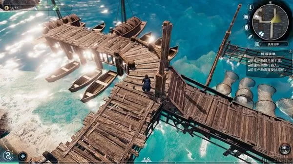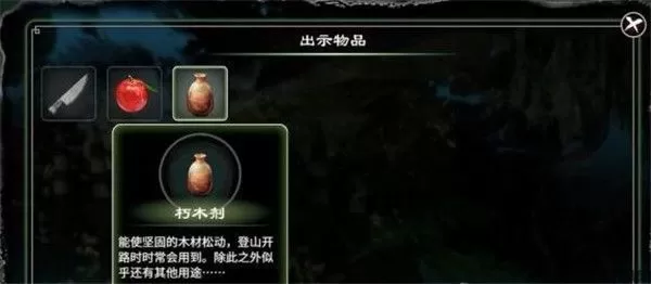3、破坏这个箱子,获得朽木剂。然后对栅栏出示朽木剂,栅栏就会变得不堪一击。敌人使用特定武学露出破绽时,对其造成伤害,就能使其力竭。注意屏幕左下角的“思考”按钮,游戏中会有大量的情报需要在这里进行推力分析。