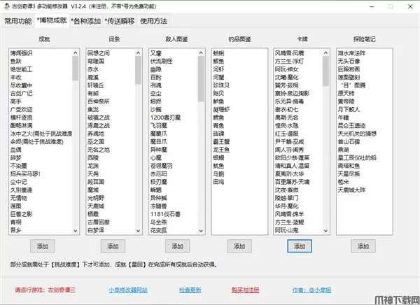 图鉴成就窗口:添加所有成就、添加钓品图鉴、敌人怪物图鉴、添加卡牌、添加博物词条、探险笔记。