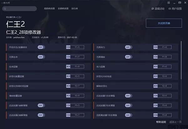 仁王2二十八项修改器是针对于仁王2游戏制作而成,此修改器相对于其他仁王2修改器而言,软件内修改功能更加全面丰富,拥有二十八项修改功能,如无限生命、无限体力、满九十九武器槽、无限弹药、一击必杀等等功能,并且操作简单易上手,丝毫不影响游戏的流畅性,为喜爱仁王2游戏的玩家带来了极大的便利性与畅快的游戏体验,为了帮助玩家感受极致的游戏体验。仁王2是一款TeamNinja制作的魂系动作类游戏,以古代日本战国后期为游戏故事背景。游戏继承了仁王1的优秀风格,残酷地融合日本神话,传说和历史,加入了全新的战斗方式“妖怪化”、使游玩的体验和成就感达到前所未有的高度。如有感兴趣的玩家,快来搭配上仁王2二十八项修改器畅游吧!