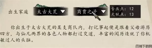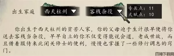3、游戏设定了十六种“出身家庭”供玩家选择根据出身高低,人物初始专长点和天赋点会有较多差异,且看天南秘境-铸剑传人比西天柱州-客栈杂役多八点基础点,反应到面板各项数据差距很明显。