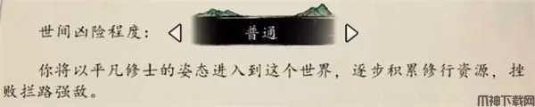 4、三种游戏难度,即简单、普通和困难,每种难度下方会有一段文字简要概述世间凶险程度,借用网络小说流派来理解,便是无敌流、修仙流、凡人流,正常体验选择普通即可。