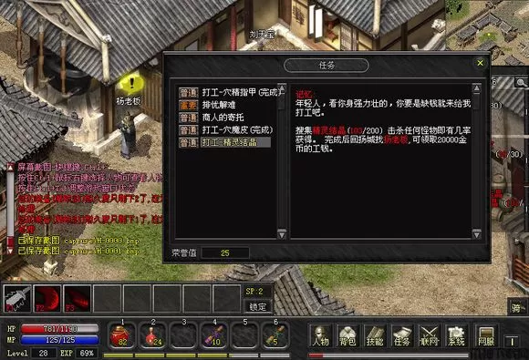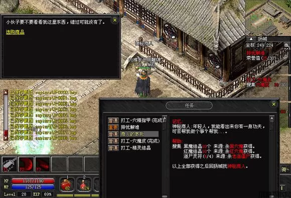 [排忧解难] 要求与城里每个NPC对话,(要求获得30荣耀值!!!)出导师房间,见到神秘商人,(注意此NPC会随时出现,在传送点可以找到他,会飞的。)与他对话,得到任务—商人的寄托,此任务的物品可配合后面的任务一起来完成,物品获得方法,任务说明有写!!!这个游戏最难的任务就是这个了,结晶的爆率相当低,如果不想跑地下刷怪爆结晶的,可以通过神秘之门传送进入(27级地下副本),一边刷装备,同时结晶也齐了!完成此任务获得荣誉值5点!