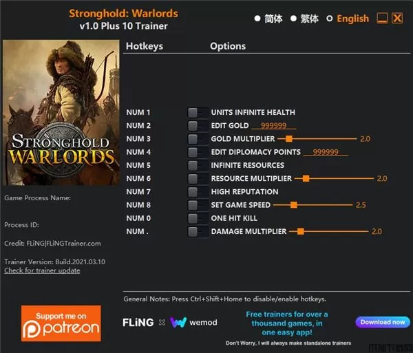 要塞军阀之战修改器风灵月影版顾名思义,这是由知名大神风灵月影针对最新策略游戏要塞军阀之战修改制作而成的游戏辅助工具,运用它能够帮助广大的玩家在畅游要塞军阀之战当中大大降低游戏难度。并且在此修改器当中拥有多种修改功能,如单位无限生命、编辑金钱、金钱倍率、编辑外交点数、无限资源、资源倍率、超高声望、设置游戏速度等十项修改功能。操作修改器时也十分简单易上手,只需启动游戏,运行修改器,按照修改器上方的功能按键操作即可在游戏当中享受修改功能的设定,欢迎感兴趣的小伙伴免费下载体验,相信有了这款要塞军阀之战修改器的加持,能够带给你们广为畅爽的游戏体验。