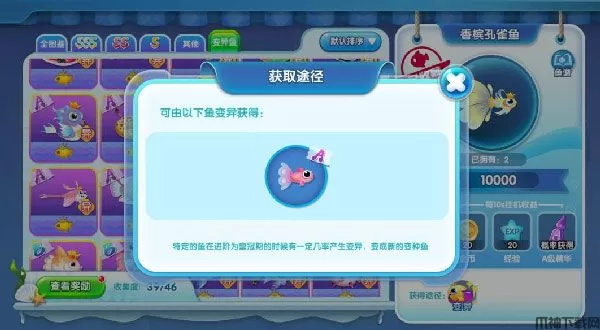 2、在获得新鱼的时候左下角都会有升阶预览,可以知道你的小鱼会不会变异。