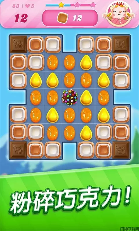 巧克力跟岩石一样,得用连线时的影响范围去炸开。另外还有一个很讨厌的规则:如果一回合中没有炸到任何一块巧克力,那该回合结束后就会产生一块新的巧克力,巧克力会受地形限制,被岩石、铁丝围住的巧克力无法越界生长。如果能清除场上所有的巧克力,则不会再度生长。条纹糖果、包装糖果、彩色糖果皆可炸开巧克力。