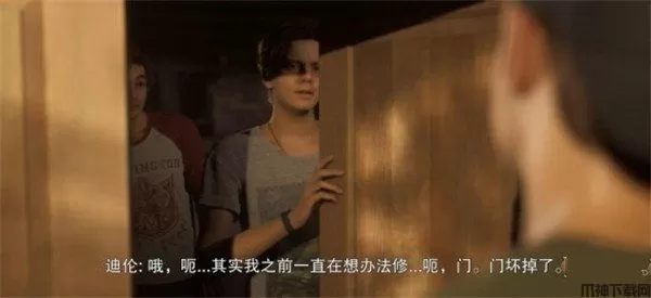 2、杰克布来到营地小屋门前,指导员迪伦和尼克为了逃避搬运行李,以门坏了为由将大门关上并锁住。