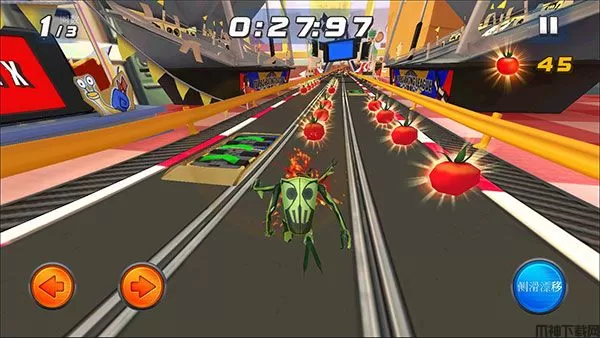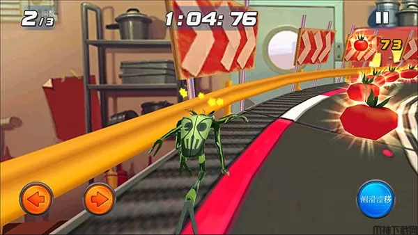 极速蜗牛游戏中共有三种比赛模式,排名模式,时间模式以及检查点模式。排名模式相信大家再熟悉不过了,就是和电脑进行一场速度较量,不过在这里每次比赛只有一名 对手与你一较高下。在比赛的过程中,除了要把握好入弯时机,抢占内线之外,沿途的路面上会有许多加速装置,只要从上面经过就会进入加速状态,但效果仅持续 数秒。而为了巩固自己的领先地位还可以“抄近道”,不过本作的近道入口可不像其它游戏那么隐蔽,它就是一个非常显眼坡道,上去之后就会进入自动导航状 态,并且这条近道貌似是由吸管所制,如果此刻你点击方向键的话,蜗牛还会绕着这根吸管进行旋转,非常有趣!