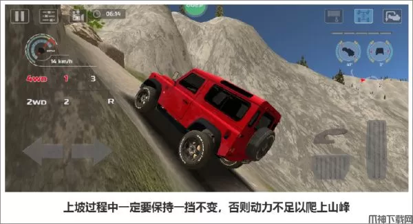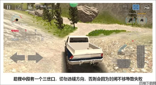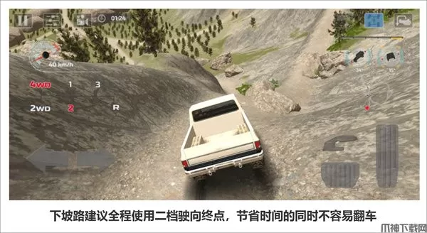 到达关卡拐角位置,如小地图的指示。建议使用一挡跨越前半段的一些碎石,后半程的下坡路段没有任何障碍物,下坡路将挡位提到二挡把握住方向,确保能够直线行驶后可将时速控制调至三挡,选取一个不容易翻车的范围内从而尽可能快地抵达终点。
