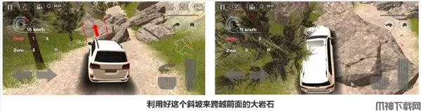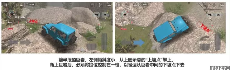 这关中的难点在于前半程的巨岩障碍。司机们需要寻找合理的点位进行攀登才能跨越成功,上坡点和下坡点在图片中已标出,可以挑选合适参照物配合点位来跨越巨岩。成功跨越前后,可以开启三挡一路向前,后续的枯枝碎石丝毫不影响吉普的优异性能。
