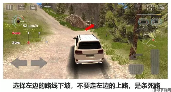 来到第六关,这关中不能使用越野车而是驾驶的一辆不耐撞的普通汽车闯关。本关的难点有两个分别是容易混淆的分岔路和终点前的复杂的岩石地势。