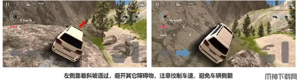 登上大岩石后车辆靠左直线行驶。紧贴墙壁档位挂至1档提高抓地力,利用左手边的倾斜山壁绕过巨岩从而直达终点。