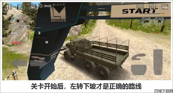 第七关里司机们驾驶的是大卡车。关卡开局就是一个分岔路需要做选择。根据小地图的指引选择左侧的下坡才是正确的路线。