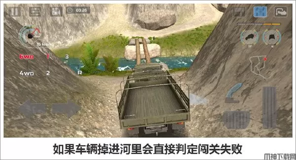 本关中的另外一个难点就是过圆木桥。需要小心耐心控制车速从木桥上通过,如果车掉到河里会直接判定为游戏失败。此处就是考验各位司机们车技基本功的时候,通过后一路直行即可抵达终点。
