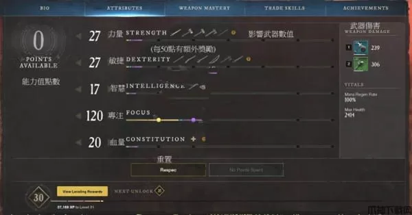 比如力量,50点提供轻攻击伤害加成,100点提供重攻击伤害加成,敏捷是提供暴击绿、背击伤害,爆头伤害,智力提供法伤、回蓝等。