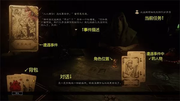此界面包括上方的遭遇事件,遭遇事件的描述,当前任务,下方的背包、对话、遭遇事件中的人物以及中间的角色位置。