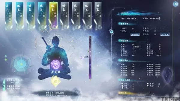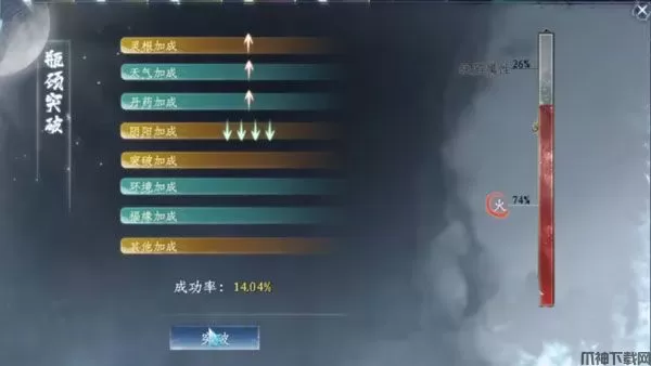 4、在使用了领取的道具之后,在自己的属性面板就会出现一个瓶子,之后通过打怪或打坐可以对这个瓶子进行修为的填充,在修为满了以后就可以开始突破了。另外点击这个瓶子还会出现一个面板,这里是对应属性的加成,还会相应的计算出玩家此时进行突破的成功率。