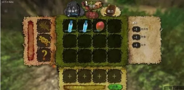 荒岛上可不只有我们小强在到处晃悠,各种野生动物也有自己的地盘。初期最好别惹他们,尤其是碰到熊的时候。鳄鱼还要勉强好对付一点,有一把小刀就能应付。不过还是那句话,一开始,躲得过就别打,弄个流血疾病什么的就麻烦了。目前可以合成的东西还不多,也没有一个列表,生存游戏嘛,这些东西都是需要自己摸索的,点击物品按加入就能放入下方的合成材料栏。点击左侧的刀、绳子等工具,可以将工具放入进行加工,例如放入树叶、放入刀,然后点击制作。材料消失了,再看看物品栏——绷带制作出来了。绷带可以解决流血的问题,流血如果不包扎的话,害死你是迟早的事,入夜后,各种威胁和麻烦就更多了。如果夜里在下一场雨,乖乖,寒冷、疾病这些负面状态一下子就出来了。夜太黑,太危险,这个时候,你就需要尽快造出一个火把了,布料、木棍、燃油、绳子,空瓶子才能接水,再点个火、弄个材火堆什么的,长夜就好过些了。玩家有时候会遇到无法开启的门,有时需要钥匙,有时就需要大型的工具,这类屋子里通常有些好东西,如果暂时不能打开,最好记住位置。有了合适的工具后,把工具放置到快捷栏然后拿出,这时点击门或者其他物体就会有一个圆形准星式的图标,左键点击准星位置就会挥动工具打击。使用这种方式也可以拿起武器进行战斗,你战斗的越多、在各种负面状态下治愈的越多、坚持的越久,你的各种属性就会相应的提升,打造小强就是要一步步把自己逼入绝境,然后一次次逃出生天。