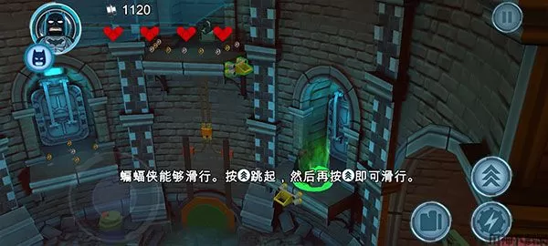 8、蝙蝠侠可以滑行,点击图示跳跃按钮,连续点击可以从高处滑行下来。