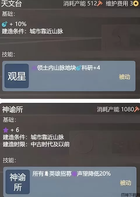 5、而一些建筑和奇观的打造条件都是需要靠近山脉,例如天文台和神谕所。