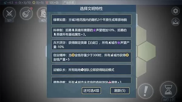 4、动态的世界地图:世界地图是动态生成的,每个玩家都可以拥有不同的领地和资源分布,增加了回放性和探索性。