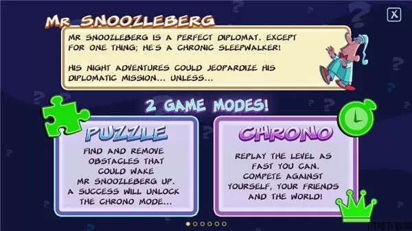 在梦游先生游戏中,我们将会遇见一位工作非常繁忙的大使先生,不停辗转于各个城市参加各种典礼。因此,在他晚上出来梦游的时候,我们必须得帮助他应对路上将可能遇到的各种危险——有时可能会掉下楼层,有时可能会被小狗吓到,有时甚至还会遇到半夜醒来尖叫的女人……总之,你一定要在大使先生遇到这些危险前及时反应过来,细心观察、并且利用周边的各种道具帮助他规避危险。
