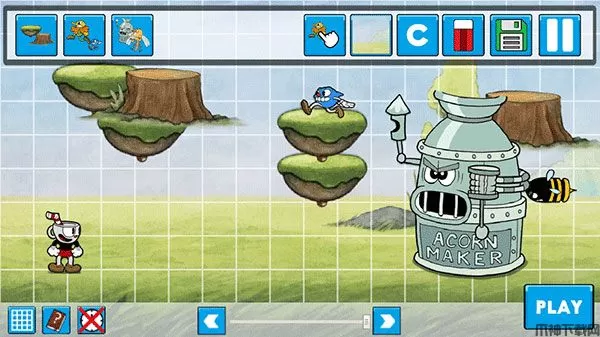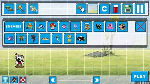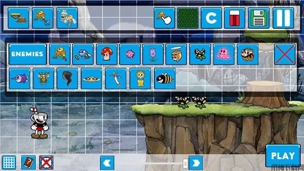 茶杯头制造手机版,它是由国外大神Mrskailo自制的一款可以自由DIY茶杯头关卡的游戏。这款游戏已经保留了茶杯头基本的手绘卡通风格和经典2D横版玩法,带有三个关卡可直接玩,更特别的是,在游戏中,所有障碍物到底如何设定都将由玩家自己决定,玩家可以自由制定关卡的类型以及难度,随意的制作摆放道具、怪物、障碍等角色,进行关卡编辑,标题页面CREAR为关卡制造,设置各种规则让你的茶杯头冒险关卡更加丰富!